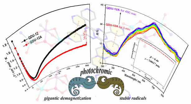 自由基在光电新型功能材料领域扮演着非常重要的角色,自由基作为中间体具有反应活性高、不稳定、寿命短等特点。如何稳定活泼的自由基一直是变色材料领域的前沿热点与关键科学问题。近日,bat365在线体育登录王国明教授课题组在《中国科学:化学》(SCIENCE CHINA Chemistry)发表题为“Optically Actuating Ultra-Stable Radicals in a Large π-Conjugated LigandConstructed Photochromic Complex”(http://engine.scichina.com/doi/10.1007/s11426-020-9891-4)的研究论文。通过设计制备出π共轭配体构筑的光致变色材料,利用对位阻效应及分子间π-π堆积作用的调控,实现超分子结构中的光生自由基长达18个月的稳定存在;并对Cu(II)离子和自由基间的反铁磁耦合调控,实现了光致变色体系最大的室温光退磁效应。这项工作对构建并稳定自由基研究提供了新思路,将有力推动光电操控材料领域的发展。论文第一作者为青年教师胡继祥和硕士生姜晓帆(共同一作),王国明教授为论文通讯作者。该研究工作得到国家自然科学基金与山东省重点研发计划等的资助。
