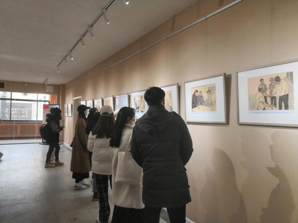 大家进入展厅认真观看了《一颗赤诚为民心·八年脱贫攻坚梦》——青岛大学省派第一书记连环画展。我校周松林教授创作的72副连环画用艺术的形式展现了省派第一书记抓党建促脱贫、推动乡村振兴的丰硕成果,记录了省派第一书记的工作历程、感人事迹,直观地展现了省派第一书记帮包村的发展变化和精神风貌。
